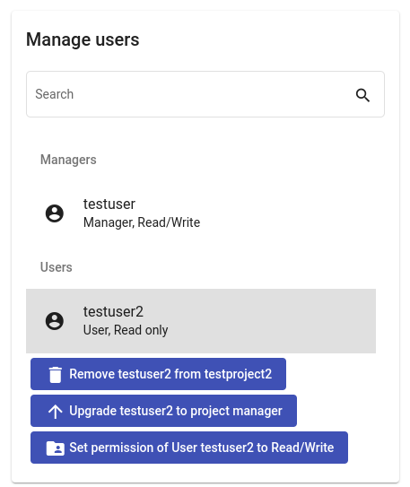 You can select from the following options: - Remove a user from the project - Set role of the user to project administrator or user - Set permission of the user to read/write or read-only
